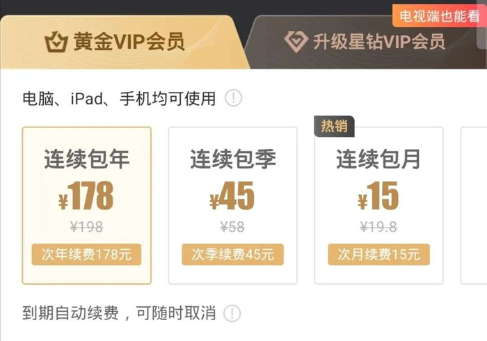 而对于爱优腾来说,他们选择了更为柔和的方式来尝试提升付费用户ARPU值,培养高净值用户的消费。比如爱奇艺推出资费更贵的超级会员“星钻会员”,相当于平台全通卡,可以享受除黄金会员外的单点付费、超前点播等额外权利,腾讯视频推出超级影视VIP,单月会员费是普通会员的两倍,适用于TV全屏通会员……