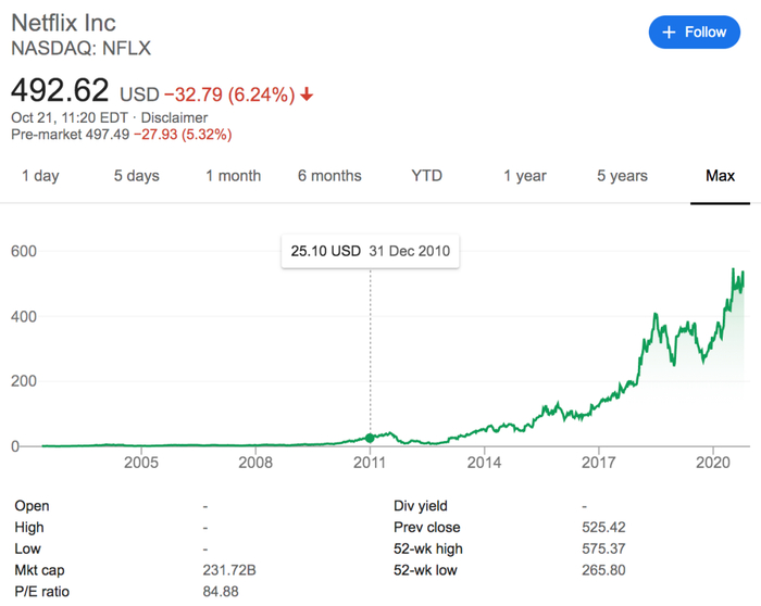 粗略估算,如果10年前购买1千美元Netflix的股票,今天价值约为9万美元。如果你错失了这支股票,第二选择可以是它的会员,因为其价格涨幅也不容小觑。