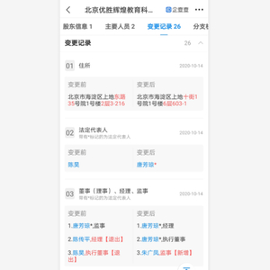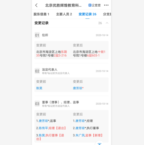 而据企查查资料显示,早在10月10日,优胜教育便因“通过登记的住所或者经营场所无法联系”而被列入经营异常。随后,14日,优胜教育的经营主体——北京优胜辉煌教育科技有限公司(下称:优胜教育)悄然发生一系列工商变更,其中,法定代表人由陈昊变更为其母唐芳琼,经理陈传平及执行董事陈昊退出,由唐芳琼及朱广凤补进。