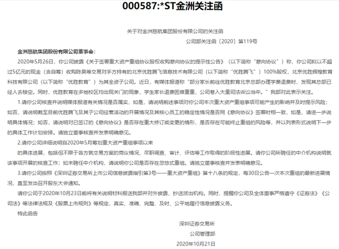 也因着收购意向这层关系,*ST金洲于10月21日收到深交所《关注函》。关注函显示,因媒体报道“部分家长前往优胜教育北京总部办理学费退费时,发现其总部已经人去楼空。同时,优胜教育在多地校区均出现关门的现象,学生家长退费困难重重,公司卷入大量司法诉讼当中”,深交所对此表示关注,并要求*ST金洲核查并说明媒体报道有关情况是否属实、以及详细说明自2020年5月筹划重大资产重组事项以来的具体进展,同时说明截至目前优胜腾飞及其子公司经营活动的开展情况及其核心员工的稳定性情况是否同《意向协议》签署时相一致等情况。
