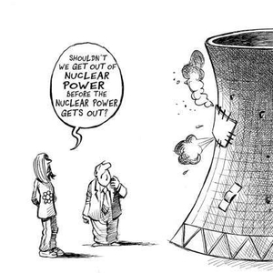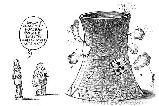 讽刺核能安全性的漫画,左边人物的对白是:“我们难道不应该在核泄漏发生之前摆脱它(核能)?” | www.globalcartoon.wordpress.com