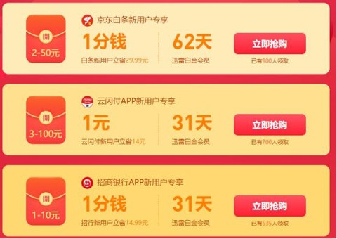 如果你是京东白条新用户,恭喜您可1分钱领取62天迅雷白金会员。支付成功还可以获得1个现金红包,最高可得50元;银联云闪付APP的新用户,通过活动页面下载APP,可领14元的优惠补贴,开1个月会员仅需1块钱,支付完成还再赠送15天迅雷会员,还可以领最高100元红包哦;招商银行APP的新用户的话,通过活动页面下载APP,1分钱可以领31天迅雷会员,支付完成也赠送1个现金红包,最高领10元。