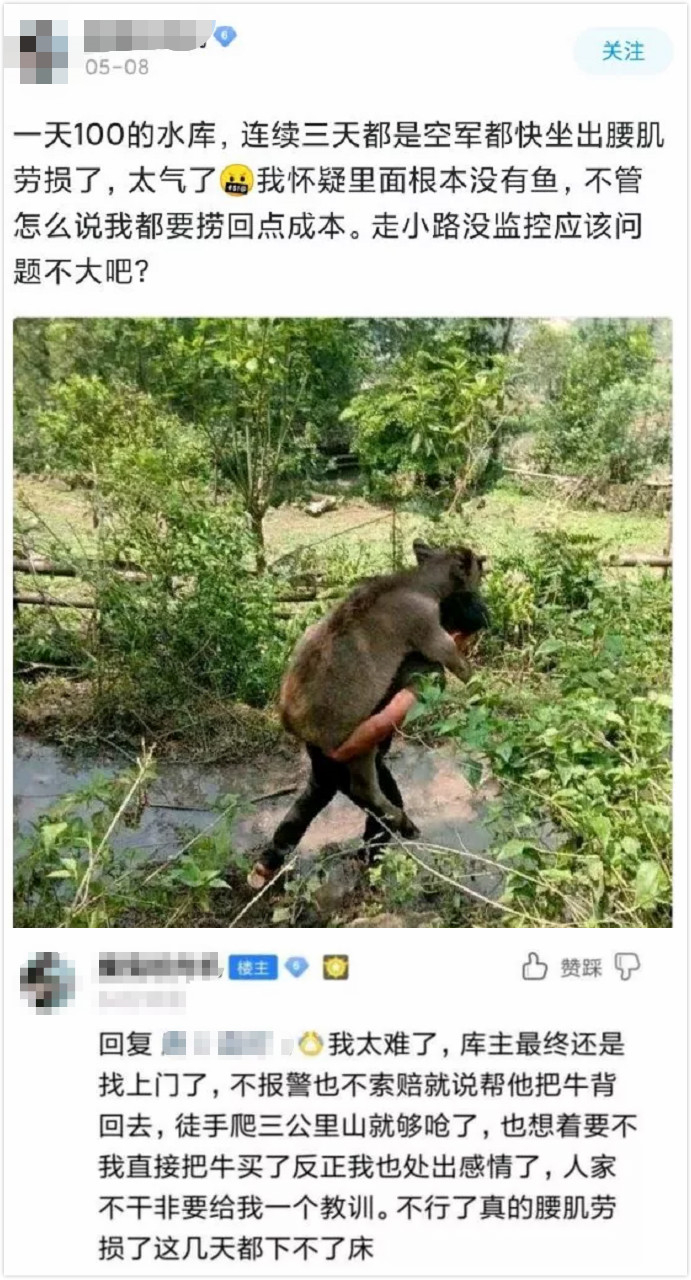 其中最著名的“永不空军”事件来自一位亏了300块钱的大哥,由于水库钓不出鱼来,他就把水库老板家的牛背走了。