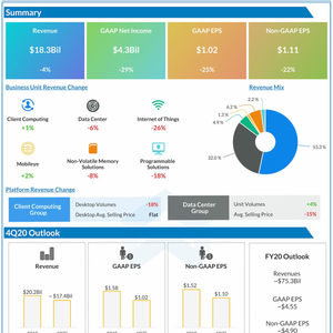 英特尔预计,2020财年第四季度营收约为174亿美元;每股收益约为1.02美元,不按照美国通用会计准则的每股收益约为1.10美元。同时预计2020财年营收约为753亿美元;每股收益约为4.55美元,不按照美国通用会计准则的每股收益约为4.90美元;自由现金流约为180亿美元至185亿美元。