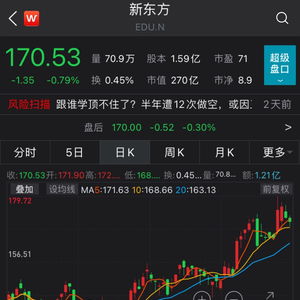 据Wind数据,截至当地时间23日美股收盘,新东方报170.53美元,最新总市值为270亿美元,按最新汇率计算,约合人民币1804.76亿元。