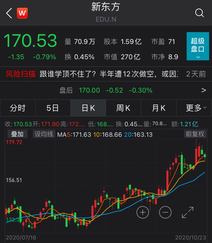 在近期赴港二次上市的预期推动下,新东方美股的股价节节攀升。据Wind数据,10月初迄今,新东方美股累计上涨14.07%,年初迄今则累计上涨40.64%,目前股价为170.53美元。