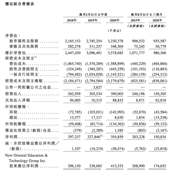 文件显示,新东方的总计净营收由截至2018年5月31日止财年的24.47亿美元增至截至2020年5月31日止财年的约35.79亿美元,复合年增长率为20.9%。股东应占净利润由截至2018年5月31日止财年的2.96亿美元增至截至2020年5月31日止财年的4.13亿美元,复合年增长率为18.1%。