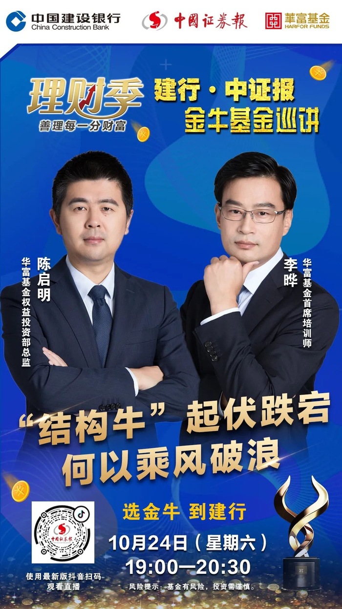 “结构牛”要结束了?市场调整该不该上车?10月24日(本周六)晚7点,华富基金权益投资部总监陈启明和华富基金首席培训师李晔做客中证报抖音直播间,围绕“‘结构牛’起伏跌宕 何以乘风破浪”的主题与粉丝进行交流,更有精美礼品等着你,使用最新版抖音扫下方海报中的二维码即可观看直播!