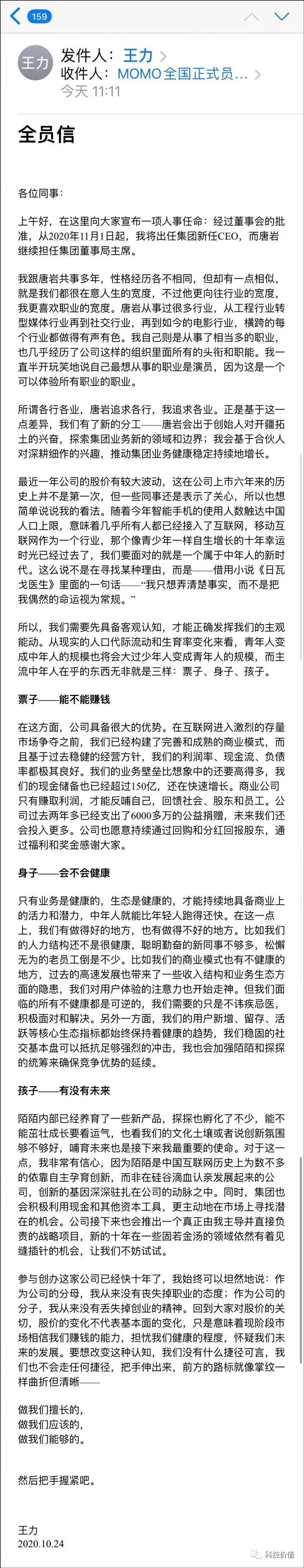陌陌内部邮件的大事件:唐岩退位,王力接任