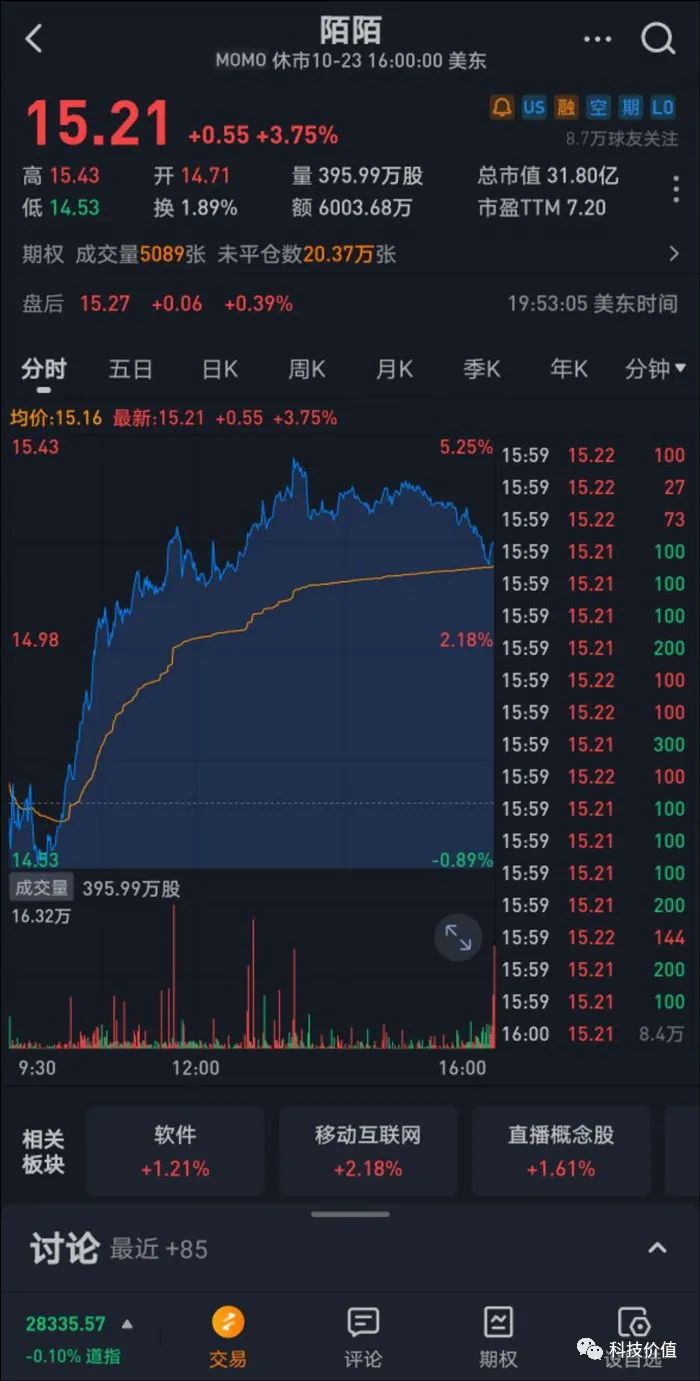 价值兄发现,2019年至2020年的陌陌,可谓是坐上了过山车的轨道。截至2020年10月24日美股收盘时,陌陌股价为15.1美元,市值为31.8亿美元,约合212.6亿元人民币。来自财经网站雪球的数据显示,陌陌的市值距离52周新低13.33美元非常接近。而陌陌最高股价曾达到40.87美元,市值曾经高达85.45亿美元,约合571.2亿元人民币左右。陌陌目前市值距离最高已经缩水近三分之二左右。