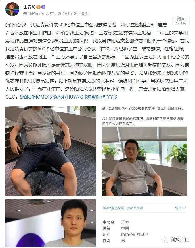 这位陌陌新任CEO到底是谁呢?尽管陌陌官方已经做了介绍,但似乎很多人对其并不熟悉。价值兄发现,去年7月份,王力还上了一次热搜,而身份是现实中的“霸道总裁”。