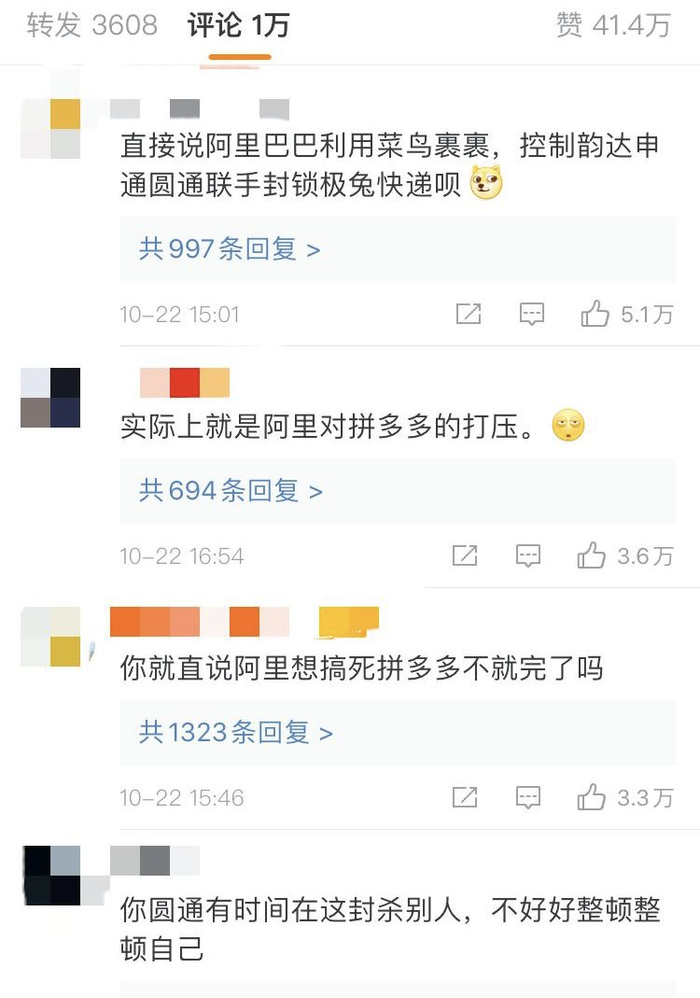 对此,网友纷纷评论:”实际上就是阿里对拼多多的打压““直接说阿里巴巴利用菜鸟裹裹,控制韵达申通圆通联手封锁极兔快递呗。”