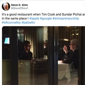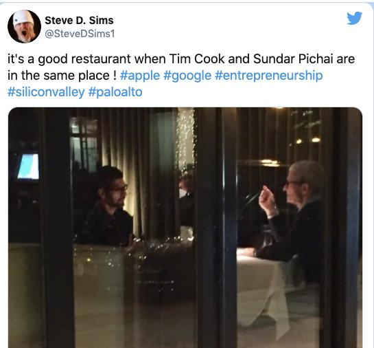 2017年的一天,苹果CEO Tim Cook和谷歌劈柴哥(Sundar Pichai)被拍到一起在一家名为 Tamarine 的高档越南餐厅共进晚餐,这张照片当时还登上了硅谷当地的小报,引发了不小的轰动,让人们津津乐道的是这两家巨头的掌门人之间到底是什么关系。