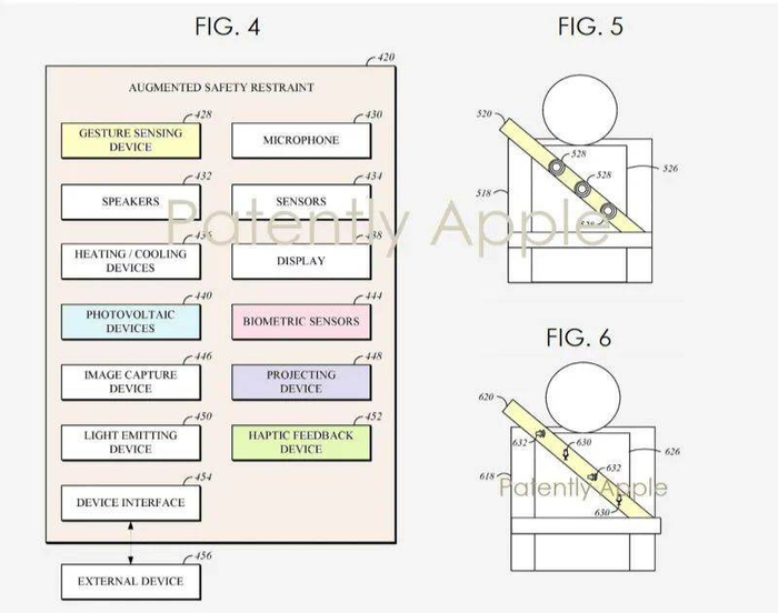 为了防止因安全气囊的弹开而可能发生的偏移,苹果在专利中也提出了几种解决方案。一是将安全气囊仓安装在安全带内,从腰部安全带处弹开;二是将安全气囊装在车顶或车厢侧面,从而直接挡住乘员的上半身。