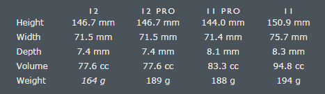 12、12 Pro、11 Pro、11的高宽深体积重量对比
