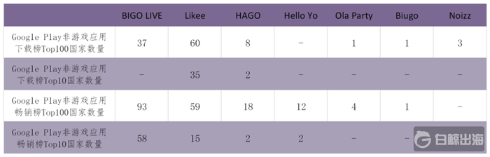 从 MAU 上看,欢聚的 MAU 是陌陌的 4 倍还多一点;从营收上看,欢聚 Q2 的营收大约是陌陌的 1.5倍。笔者猜想这或许就是明明欢聚的营收的结构比陌陌更不“健康”,但陌陌却承受更多质疑的原因吧。这些数据里藏着贡献收入市场的单一vs 多样化,MAU(流量)结构对外部的依赖程度高 vs 低,决定了 2 家公司的抗风险能力、前景和市值。根据 App Annie 数据,目前欢聚旗下共有 40 款 App,其中 15 款 App 面向海外市场发行,在这之中有 7 款 App目前正位列海外 Google Play 非游戏应用下载榜或畅销榜 Top100,其中 BIGO LIVE、Likee、HAGO、Hello Yo、Ola Party 更是可以稳列一些国家的 Google Play 非游戏畅销榜 Top20,产品矩阵比较丰富、榜单数量足够好看。