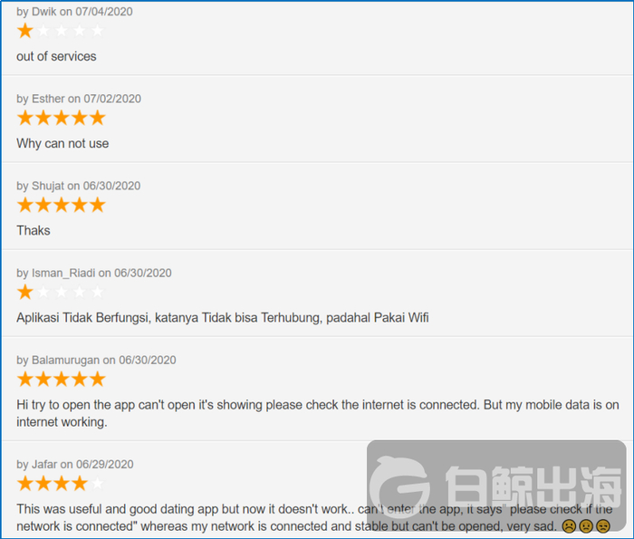 其实陌陌不是没尝试过出海,客观地说陌陌出海已经有 9 年历史了。早在 2012 年陌陌就曾在美国上线陌陌海外版 Mo,但因水土不服被迫搁浅。后又于 2014 年以陌生人群聊交友 App Blupe 再次出征,但铩羽而归。直到 2019 年陌陌在印尼上线了约会交友 App Olaa,笔者进行了以日为单位的观察,但很遗憾没过多久,在 App Annie 上已经查无此 App 了。也有不少用户在 App 底下评论为什么不能使用 Olaa 了,这一切的一切都在昭示陌陌出海再次折戟。