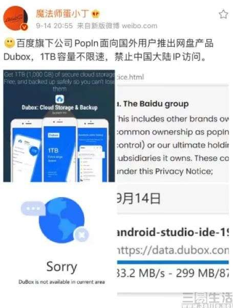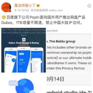但其近期在海外市场上线的一款网盘产品,则再次将百度网盘推上了风口浪尖。日前,据博主@魔法师蛋小丁 爆料称,百度旗下公司PopIn面向海外用户推出了网盘产品Dubox,提供了1TB容量且不限速。而这一消息一经曝光,很快就引发了诸多网友的热议。