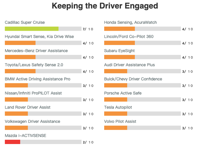 CR表示,监视员监控系统是Super Cruise依旧排名第一的原因,因为在研究涉及使用这些系统的致命公路撞车事故时,美国NTSB的调查人员强调了“自动驾驶自满”的风险(当人们过于依赖自动系统而无法完成驾驶任务时)以及可预见的系统滥用在未设计为安全使用的位置或条件下。