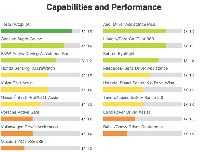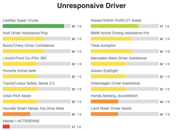 和2018年一样,2020年的《消费者报告》评测体系,同样包括了一下五个类别:功能和表现(Capablity and performance)、驾驶员的参与度(Keep the driver engaged)、易用性(Ease of use)、切换的清晰程度(Clear when safe to use)、以及驾驶员无反应时的应对(Unresponsive Driver)。