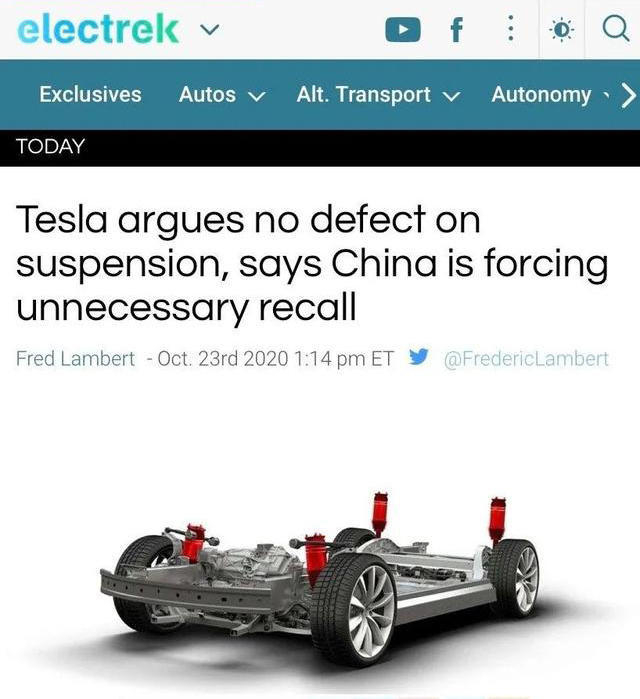 特斯拉称“不管是美国还是中国的Model S和Model X车型,它们都采用同样的悬架系统,中国市场悬架发生问题的概率达到了0.1%,全球其他地区车型发生问题概率为0.05%,证明是中国车主使用不当造成,车辆本身并无问题。”