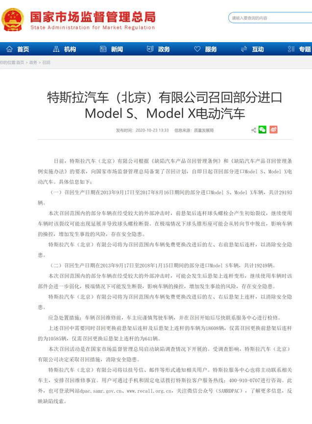时间回到10月23日,特斯拉汽车(北京)有限公司根据要求,向国家市场监督管理总局备案了召回计划,将召回生产日期在2013年9月17日至2017年8月16日期间的部分进口Model S、Model X车辆,共29193辆。也就是改款前的Model S、Model X。