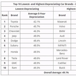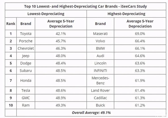 你大可以认为这个折旧率和保值率成相反关系,丰田的五年折旧率只有42.1%,紧随其后的是保时捷,折旧率为45.7%。虽然雪佛兰的排名也比较高,但是在北美市场,受欢迎的雪佛兰车型往往是皮卡,所以我们选择和本田对比,丰田的42.1%对比本田的48.5%优势非常明显。而如果把保时捷和玛莎拉蒂对比,玛莎拉蒂的五年折旧率高达69.0%,优势更加一目了然。这两个品牌在国内的保值率也不低,譬如丰田卡罗拉的三年保值率为61.91%,保时捷Macan保值率为73.29%。虽然一些人对于汽车保值率不太关心,但是还是有相当一部分人群在意保值率的,因为他们购买一辆车,可能理想的使用年限只有三五年。