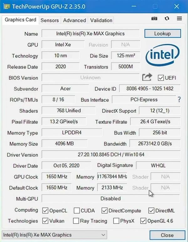 目前,已经有网友拿到搭载Xe Max独显的宏碁非凡S3X笔记本,但是由于尚未完全支持CPU-Z,因此只能正确显示工艺、架构、流处理器、核心和显存频率等。在3D Mark跑分中,Time Spy得分为1826,Fire Strike得分为6611,这一性能超越MX450,十分接近GTX 1050Ti Max-Q。