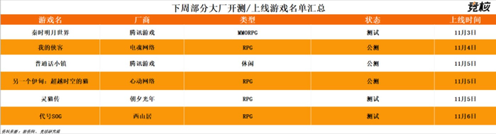 据游资网统计,下周上线、测试产品的热门厂商有腾讯游戏、电魂网络、心动网络、朝夕光年、西山居等。