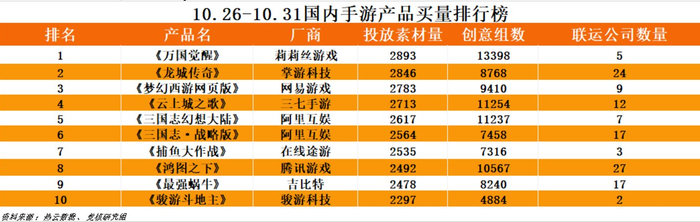 从整体大盘来看,10月26日—10月31日买量主战场仍为头部SLG手游。