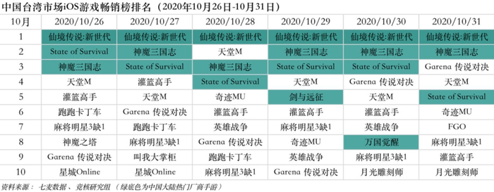 中国台湾市场2020年10月26日—10月31日IOS游戏类畅销榜中,骏梦游戏新产品《仙境传说:新世代的诞生》、昆仑万维《神魔三国志》和FunPlus《State of Survive》三足鼎立,几乎包揽了本周的前三名。
