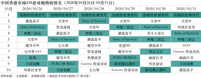 中国香港市场2020年10月26日—10月31日IOS游戏类畅销榜中,昆仑万维、FunPlus、米哈游、腾讯、莉莉丝、网易等多家内地知名游戏厂商旗下产品登入榜单。