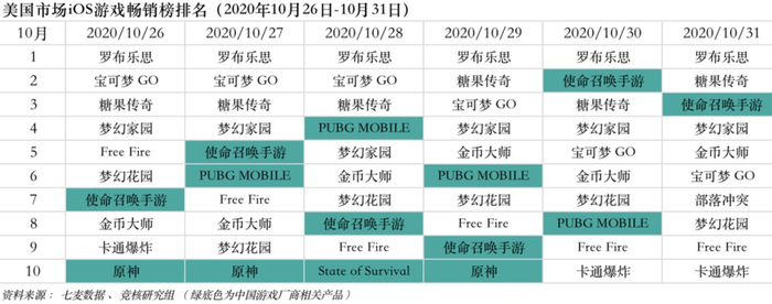 2020年10月26日—10月31日美国IOS游戏类畅销榜中,腾讯《PUBG MOBILE》《使命名召唤手游》、米哈游《原神》、FunPlus《State of Survival》登入Top10榜单。