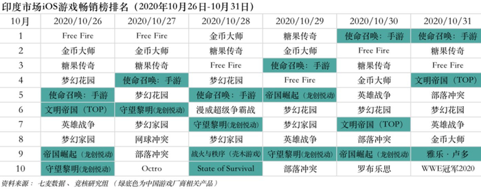 2020年10月26日—10月31日印度IOS游戏类畅销榜中,腾讯、龙创悦动、TOP GAMES、Funplus、雅乐科技、壳木游戏等厂商旗下手游进入Top10榜单。