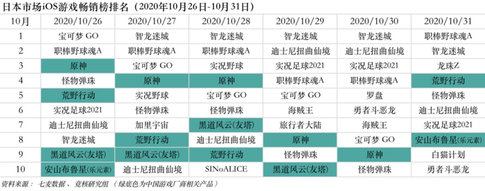 日本2020年10月26日—10月31日IOS游戏类畅销榜中,网易、米哈游、友塔网络、乐元素进入Top10行列。