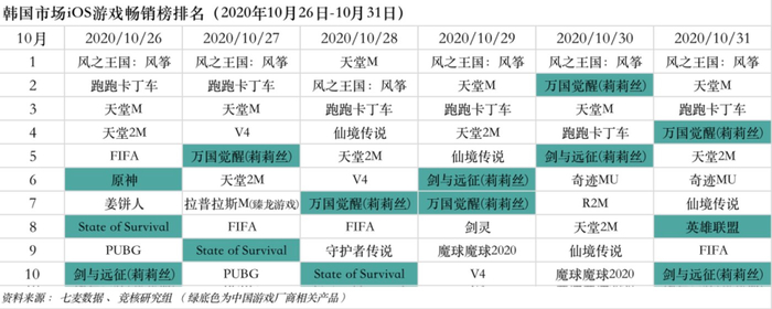 2020年10月26日—10月31日韩国IOS游戏类畅销榜中,莉莉丝、米哈游、FunPlus均有游戏上榜。莉莉丝仍是最大赢家,旗下《剑与远征》《万国觉醒》两款产品均有上榜。