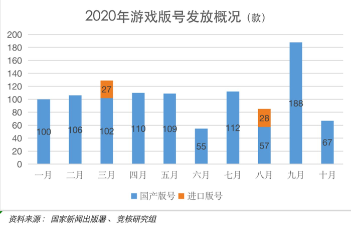 具体到每个月,2020年1月至10月分别下发游戏版号数为:100、106、129(进口27)、110、109、55、112、85(进口28)、188、67,平均每月约116款。