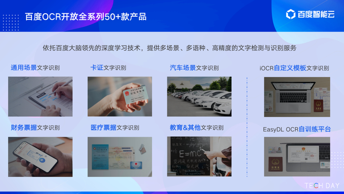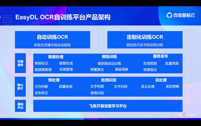 OCR(文字识别)技术是最早应用于企业降本增效的 AI 方向之一,如今已逐渐下沉为企业智能化升级的一项重要基础设施能力。10月29日,百度智能云线上线下同期举办了TechDay OCR技术创新沙龙,深度分享OCR产品矩阵、功能、应用案例等最新进展,并重磅全新发布EasyDL OCR自训练平台。泰康保险集团、北京融汇金信等企业伙伴在现场分享了OCR在企业内的应用经验和心得。百度智能云OCR产品为企业打造了技术领先、类型丰富同时支持便捷自定制的解决方案,已广泛应用于金融服务、财税报销、快递物流、法律政务、交通出行、教育培训、内容审核等全行业领域,加快推动企业实现产业智能化升级。