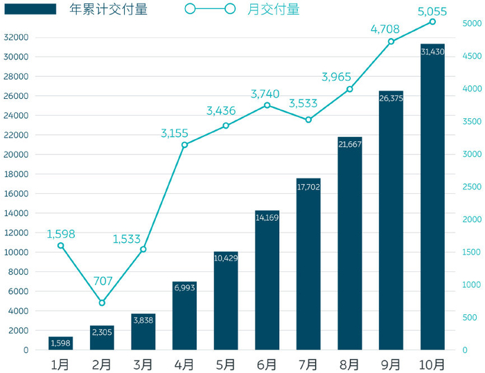 2020年1月至10月,理想ONE已累计交付21852辆。截至10月31日,理想汽车在全国已有41家零售中心,覆盖36个城市。 考虑到理想目前只有一款车型,单月3692辆的表现已经相当不俗了。