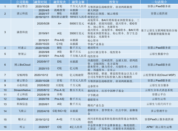 2019-2020年 云原生相关公司融资情况 来源:36氪根据公开资料整理