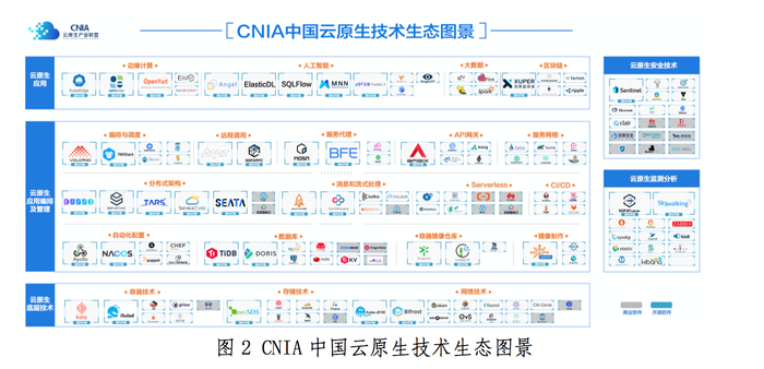 若将“云原生”这一理念落地,进行产业、架构或者是生态上的拆解。根据中国云原生产业联盟对中国云原生领域的参与者的归类,大致可分为云原生底层技术、云原生应用编排管理、云原生应用、云原生安全技术、云原生监测分析五大方向。
