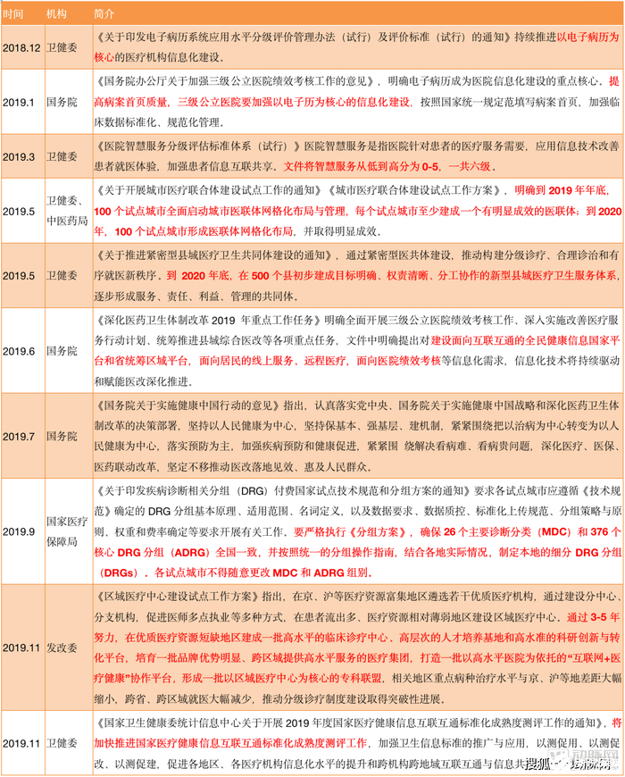 第一,国内政策明晰,医疗信息化势在必行。从2018年起,电子病历、病案首页质控、智慧医院、互联互通、远程医疗等相关政策陆续发布,医疗信息化已然大势所趋。在诸多政策的推动下,医院更加重视智慧医疗,逐步加强信息化建设,努力打造智慧医院。另外,医联体建设及DRG支付的推进间接促进医疗信息化,相关市场前景广阔。