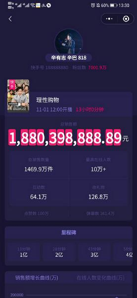 不同于电商平台的头部主播坐享巨大平台流量入口,销售额动辄出现几十亿“奇迹”,拥有7000万粉丝的快手主播辛有志再次硬拼突围,以11月1日直播13小时18.8亿的销售额引发直播圈的关注。这场教科书般的直播不止刷新了此前他单场12.5亿的个人纪录,更携辛选供应链掷地有声地带多个品牌“出圈”。