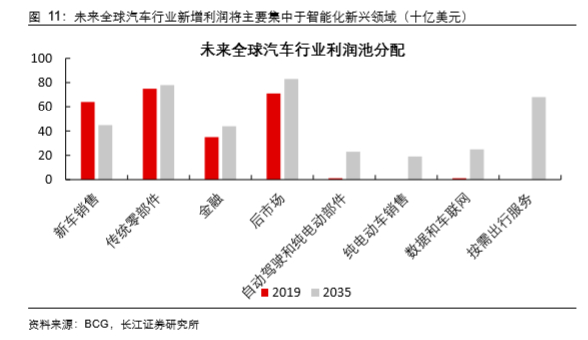 根据 BCG 的预测,原有的传统制造与销售环节,例如新车销售、零部件制造等,未来的利润增长将放缓,相对而言,自动驾驶、新能源车、 车联网、按需出行等新兴领域将成为推动未来产业利润增长的核心动力。