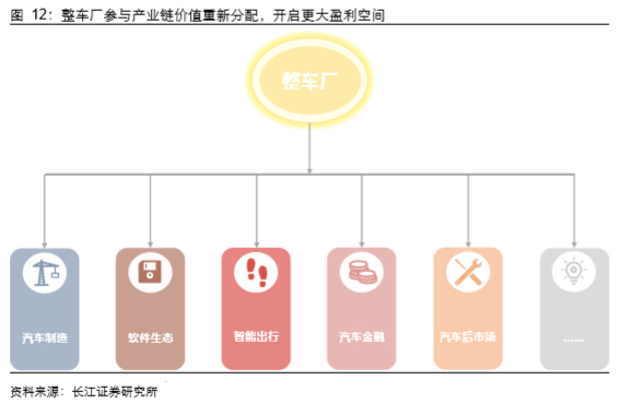 在汽车智能化趋势下,传统销售环节的重要性逐渐降低,整车厂有望参与汽车全产业链价值分配,盈利模式得到极大丰富。