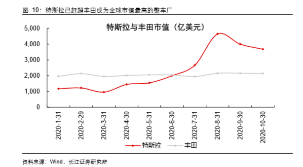 不过,2020 年以来,特斯拉、蔚来、理想等新兴势力的市场表现受到高度认可,其中特斯拉在 2020 年 6 月已赶超丰田成为全球市值最高的整车厂。