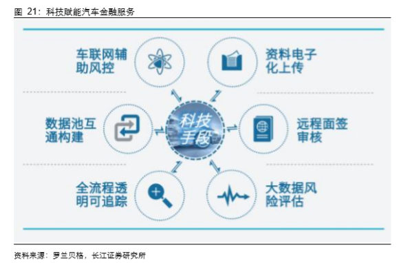 1)降本增效。汽车金融未来线上化运营是发展的主要方向,基于与整车厂的数据实时打通,建立车型与用户数据库,有助于优化线上申请、审 批、评估、放贷流程,既降低了汽车金融运营成本,也提升了消费者贷款体验;