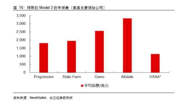特斯拉因为本身较高的成本以及特殊的制造工艺(全铝车身等),其保险费用较高。据统计,美国 Model 3 平均年保费约 2200 美元,比全美汽车保险平均水平高50%以上(美国平均汽车售价约3万美元)。