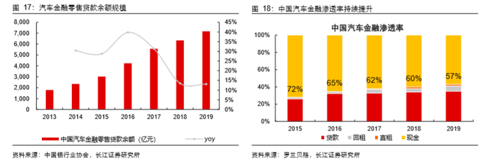 2015 年中国现金购车比例约为 72%,到了 2019 年已下降至 57%,从绝对量上看,2019 年汽车金融零售贷款余额 7194 亿元,同比增长 13%,也逐渐形成了海量市场。