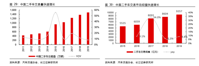 供需共振下,我国二手车交易量保持较快增长,2019 年二手 车交易量达到 1492 万辆,同比增长 8%,交易金额为 9357 亿元,同比增长 8.76%。